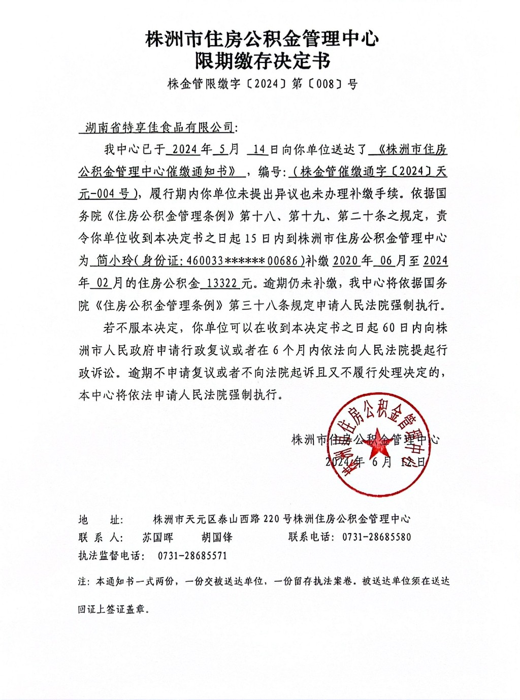 关于对湖南省特享佳食品有限公司限期缴存决定书的公示