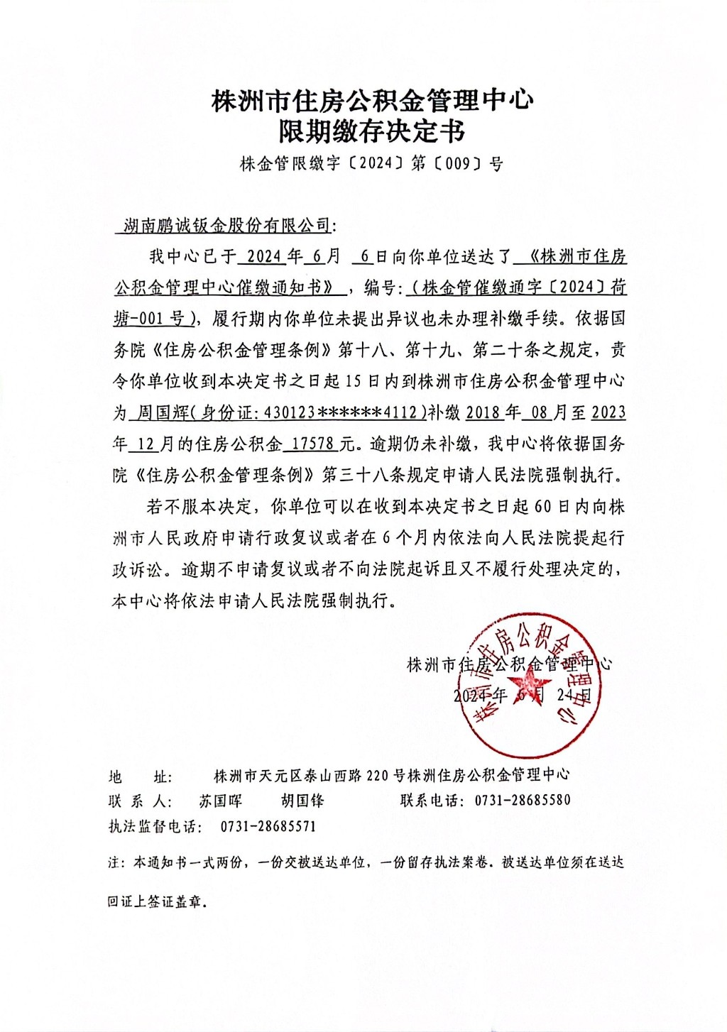 关于对湖南鹏诚钣金股份有限公司限期缴存决定书的公示