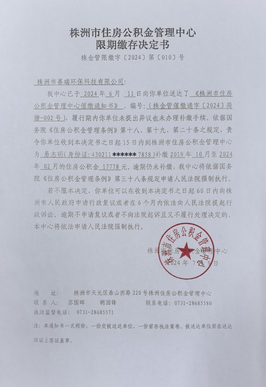 关于对株洲市善瑞环保科技有限公司限期缴存决定书的公示