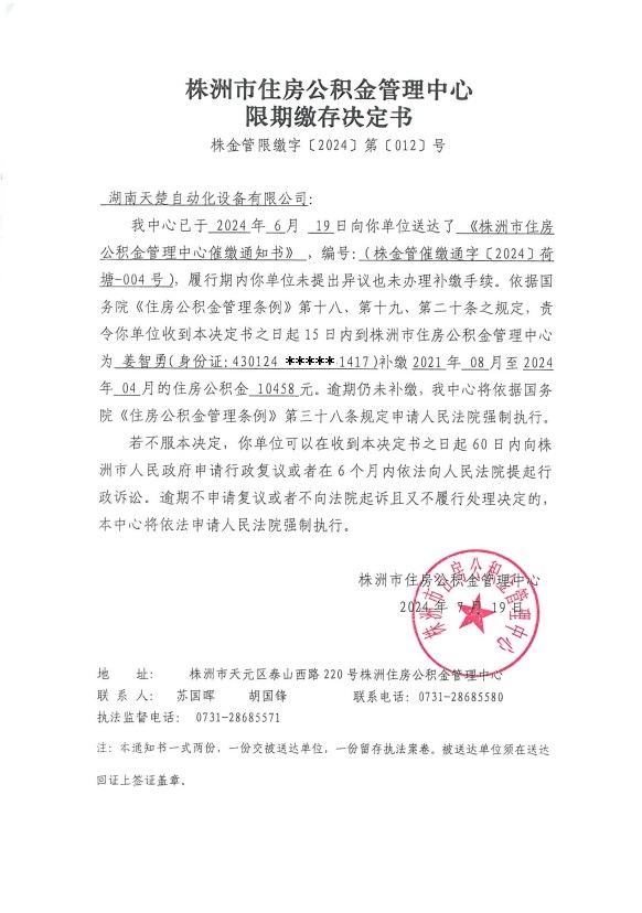关于对湖南天楚自动化设备有限公司限期缴存决定书的公示