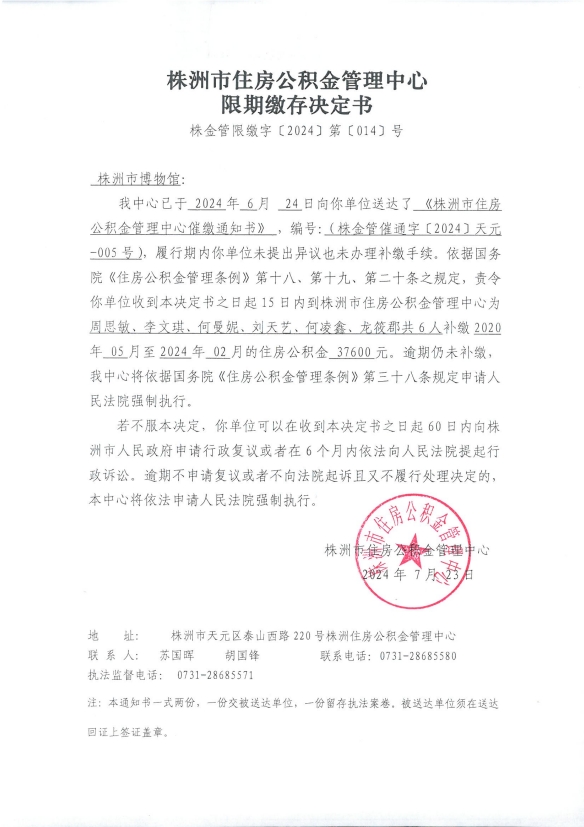 关于对株洲市博物馆限期缴存决定书的公示
