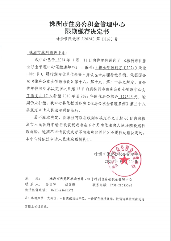 关于对株洲市北附高级中学限期缴存决定书的公示