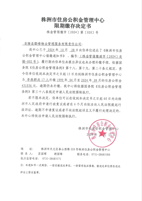 关于对炎陵县酃峰物业管理服务有限责任公司限期缴存决定书的公示