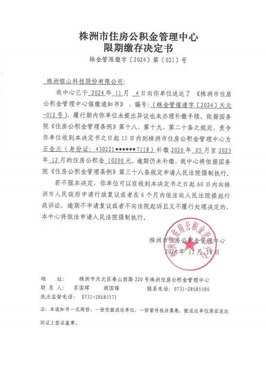 关于对株洲铭山科技股份有限公司限期缴存决定书的公示