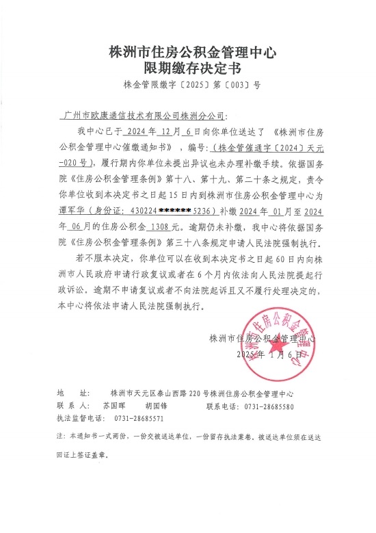 关于对广州市欧康通信技术有限公司株洲分公司限期缴存决定书的公示