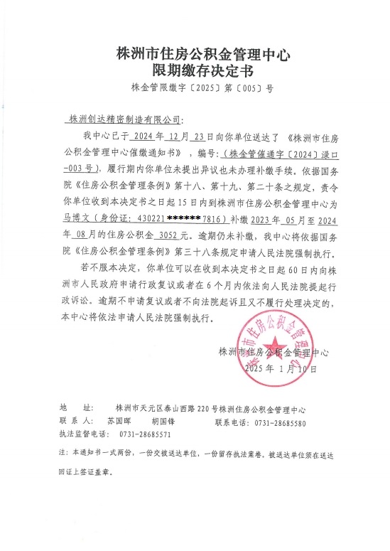 关于对株洲创达精密制造有限公司限期缴存决定书的公示