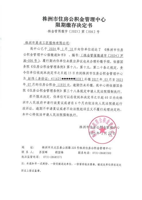 关于对株洲市美衣工匠服饰有限公司限期缴存决定书的公示