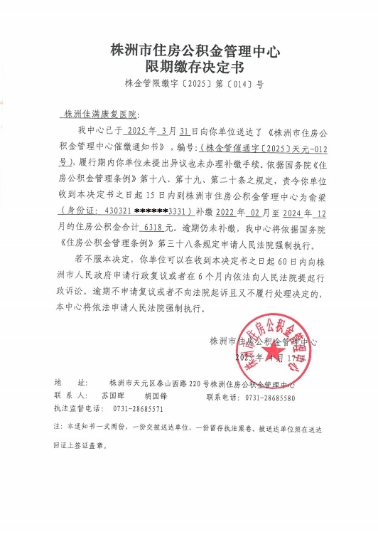 关于对株洲佳满康复医院限期缴存决定书的公示
