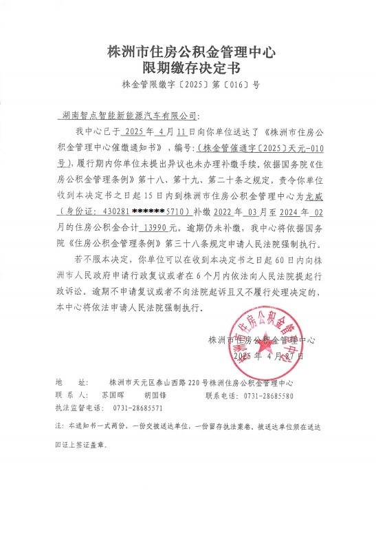 关于对湖南智点智能新能源汽车有限公司限期缴存决定书的公示