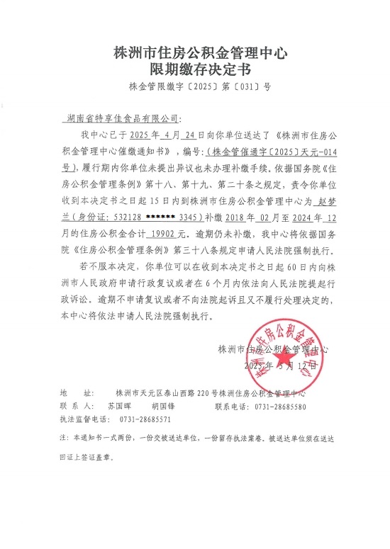关于对湖南省特享佳食品有限公司限期缴存决定书的公示