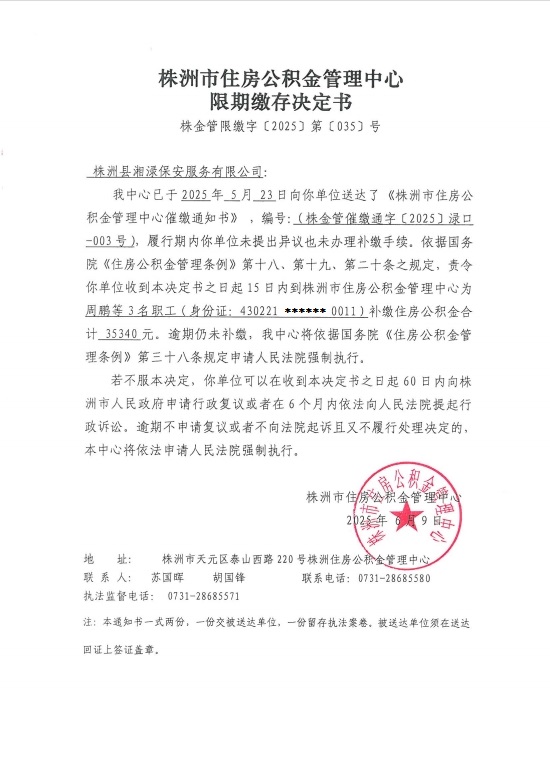 关于对株洲县湘渌保安服务有限公司限期缴存决定书的公示