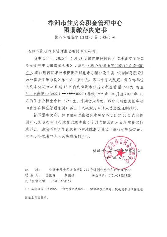 关于对炎陵县酃峰物业管理有限责任公司限期缴存决定书的公示