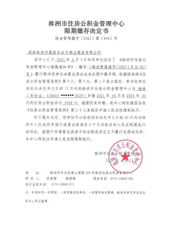 关于对湖南株洲市雅居乐水木物业服务有限公司限期缴存决定书的公示