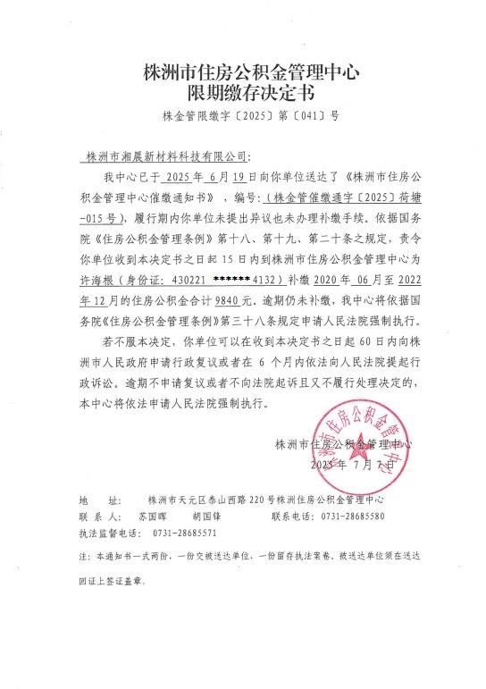 关于对株洲市湘晨新材料科技有限公司限期缴存决定书的公示