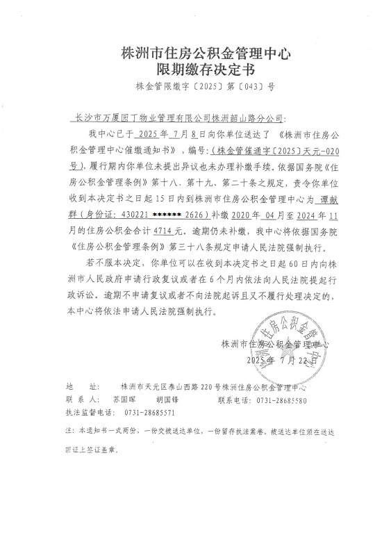 关于对长沙万夏园丁物业株洲韶山路分公司限期缴存决定书的公示