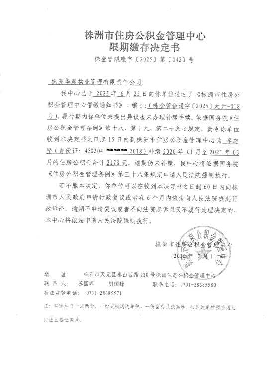 关于对株洲华晨物业管理有限责任公司限期缴存决定书的公示