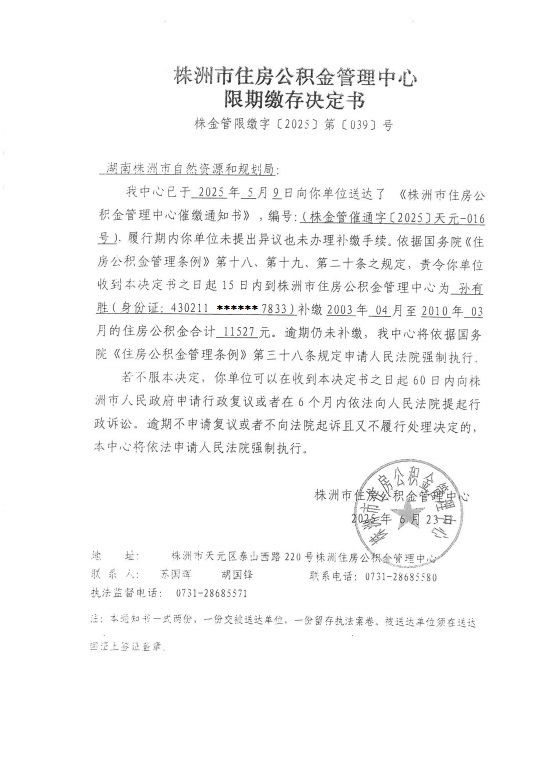 关于对湖南株洲市自然资源和规划局限期缴存决定书的公示
