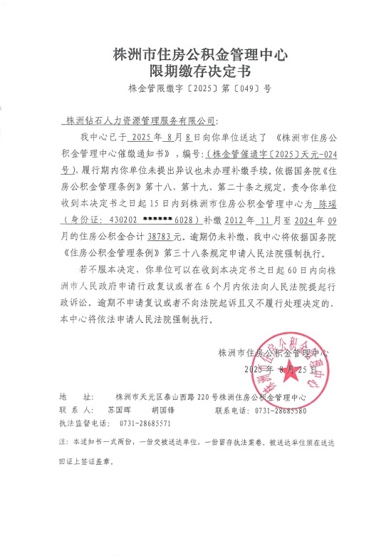 关于对株洲钻石人力资源管理有限公司限期缴存决定书的公示