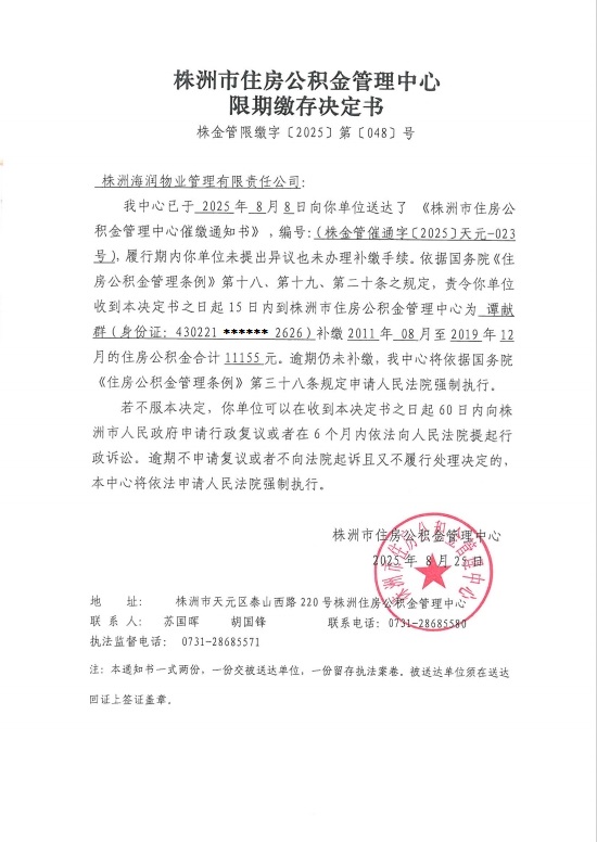 关于对株洲海润物业管理有限责任公司限期缴存决定书的公示