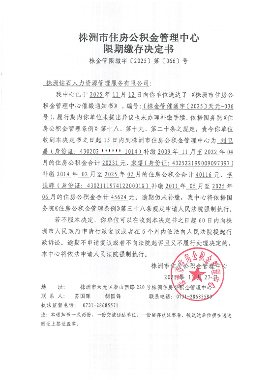 关于对株洲钻石人力资源管理服务有限公司限期缴存决定书的公示