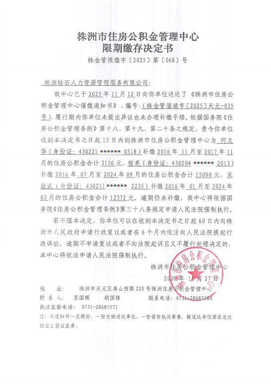 关于对株洲钻石人力资源管理服务有限公司限期缴存决定书的公示