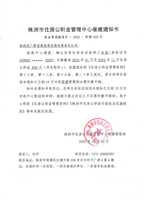 关于对株洲武广新里程投资发展有限责任公司催缴通知书的送达公告