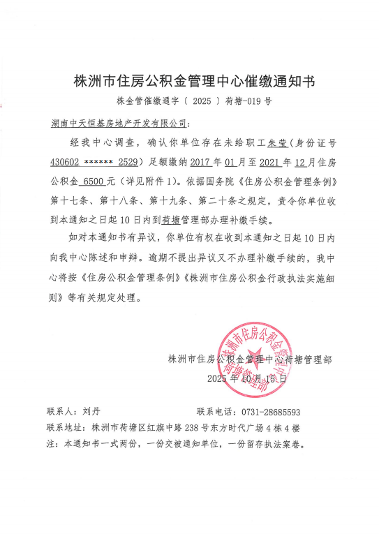 关于对湖南中天恒基房地产开发有限公司催缴通知书的送达公告